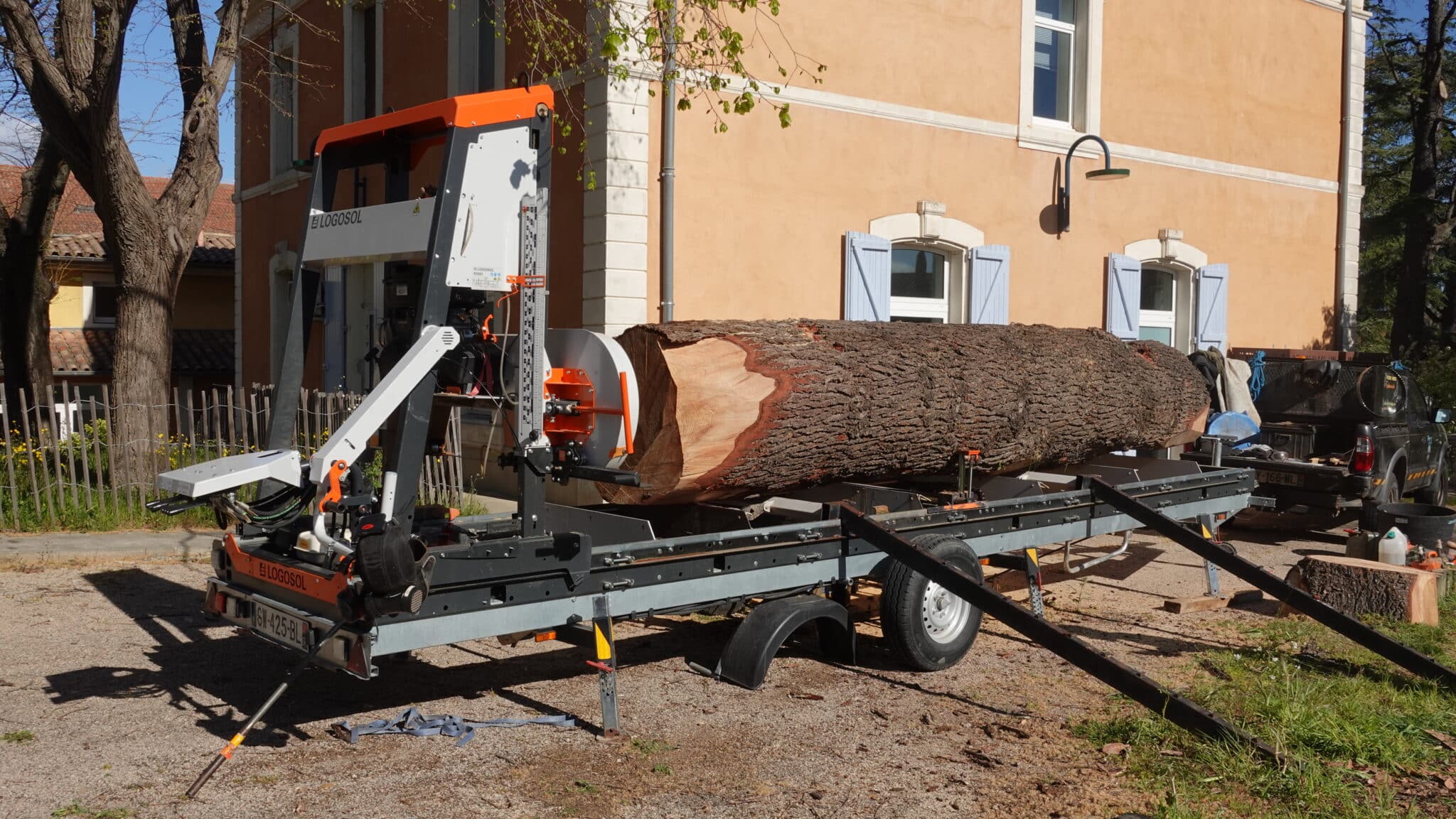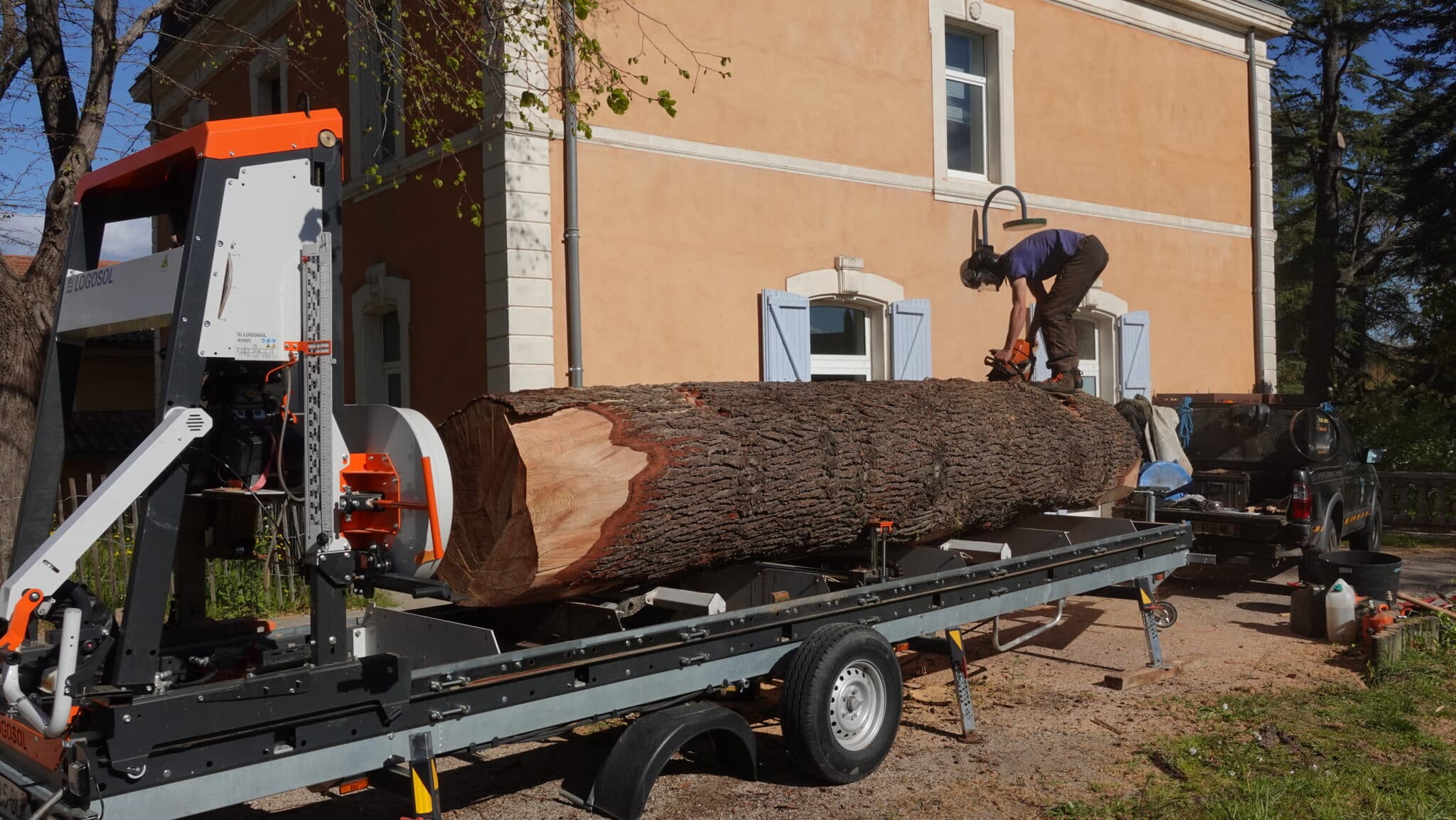 Plutôt que de laisser ce bois inexploité, la Communauté de communes a fait le choix de le valoriser localement. Le cèdre, qui mesurait près de 10 mètres de haut pour un tronc de 92 cm de diamètre, a été débité directement sur site grâce à une scierie mobile.